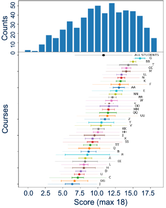 Aggregated results for 568 students in a beta test of the QCCS across 40 different courses. Averages for each course is shown below the histogram, we see wide variation across classes, populations and pedagogical approaches.