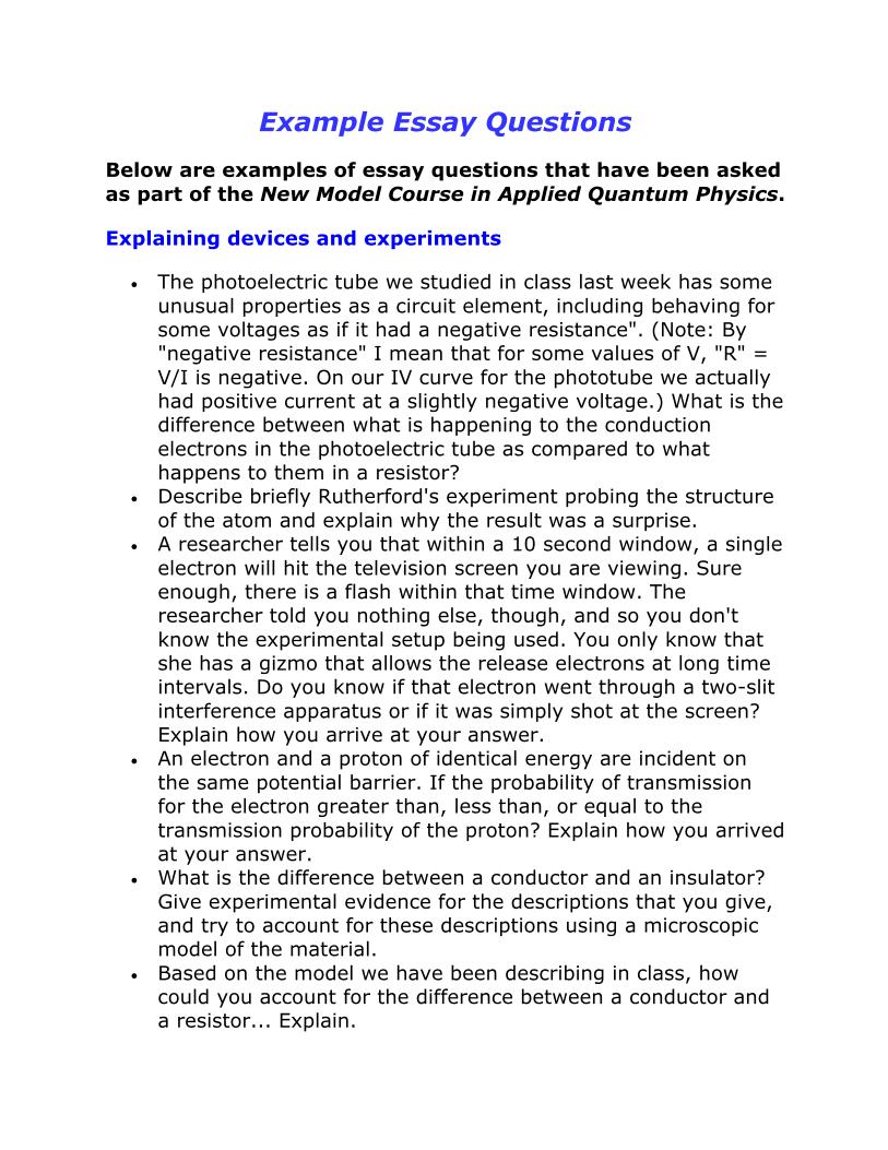 An important component of student learning is the ability to communicate their reasoning in a variety of settings and methods. Assigning essays enables students to answer non-mathematical questions that emphasize conceptual understanding. These questions allow students to discuss concepts from many different parts of the course, including tutorials, homework, and the readings. Assigning essay questions can be adapted according to your needs. There are two philosophies for assigning essays to students.